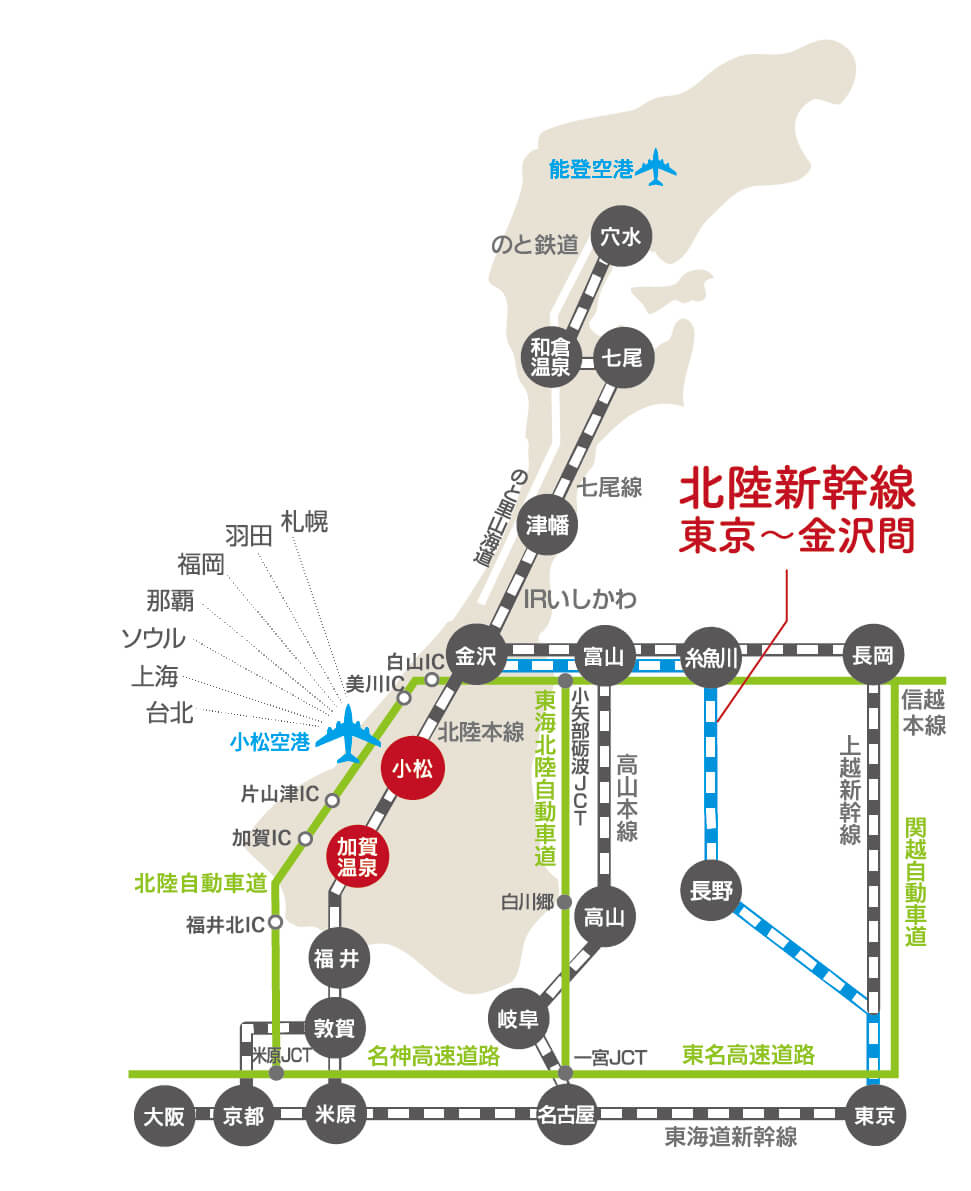 - 東京—金沢—松任駅—美川駅—小松駅—粟津駅—加賀温泉駅