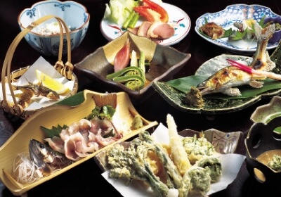 白山麓の食文化白山麓エリアで提供される「白山百膳」は山のもんづくしの健康ごはん。堅豆腐、川魚、そば、ジビエ、山菜など、健康、長寿、ヘルシー、オリジナリティにこだわったお膳が楽しめます。