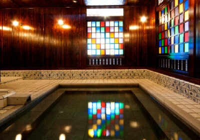 古総湯明治時代の共同浴場の建築と入浴法を再現した「古総湯」。熱めの湯に浸かった後は、開放的な2階で湯の曲輪を見下ろしてひといき。
