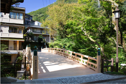 山中温泉は、大聖寺川がつくる緑豊かな鶴仙渓沿いにある温泉地です。奈良時代の高僧・行基が温泉を発見したとされ、鎌倉時代に能登の地頭、長谷部信連が温泉地を再興しました。