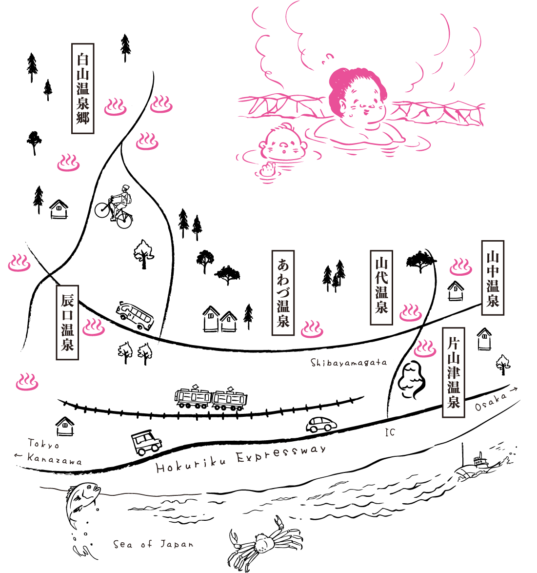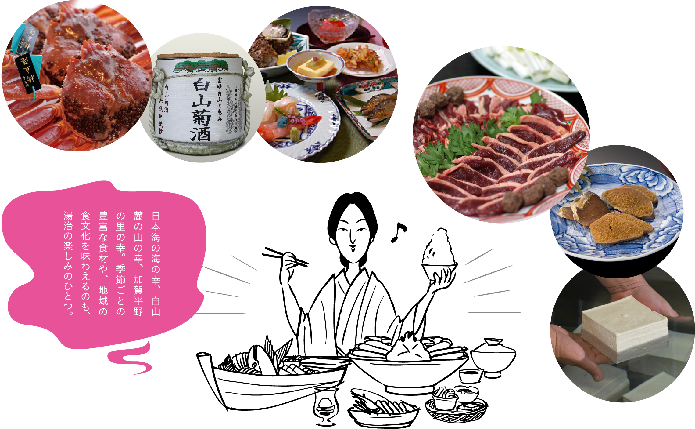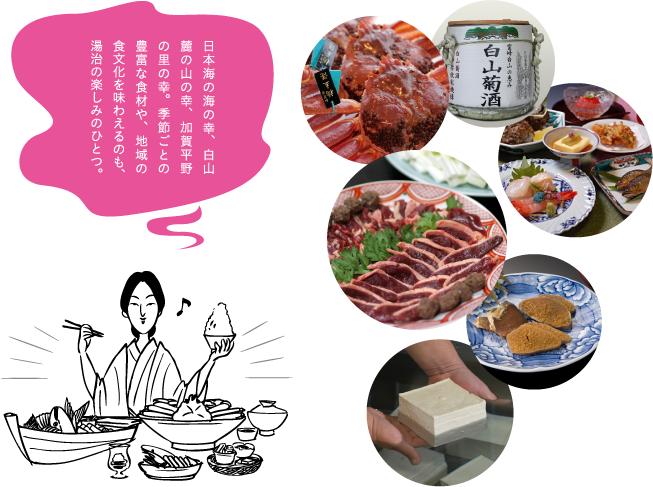 6つの温泉地では、心身を養生し、免疫力を高める場としての温泉の価値を再定義して、「霊峰白山めぐみの湯治」を新たに提案します。自然いっぱいの中で深呼吸し、おいしいものを食べ、地球の生命力が凝縮された温泉に「文化」とともに浸る…。あなただけの、大切な時間を「加賀の國」でお楽しみください。